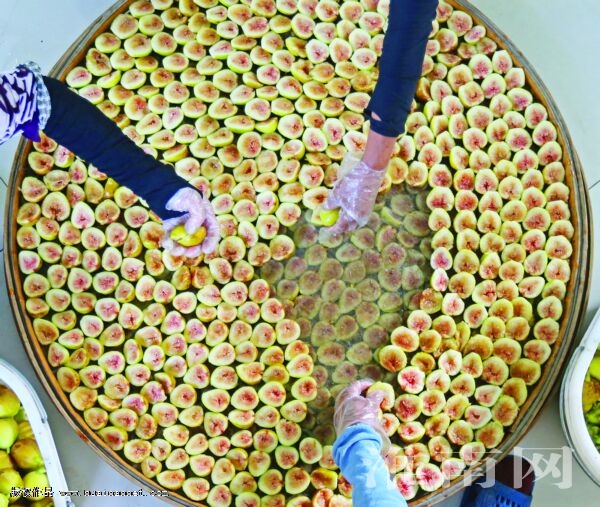 图六:毛集实验区焦岗湖镇皖淮梦无花果专业合作社20多名采摘工在60个温室大棚内紧张有序地采果,仅在焦岗湖一带,无花果种植面积就有500多亩,现已获得国家绿色农产品产地认定证书,这些无花果除直接进入各大超市,还通过电商平台销往全国各地。