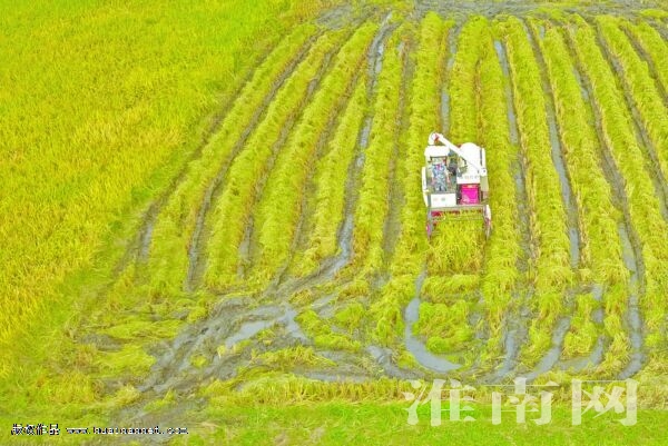 图一:大通区九龙岗镇秋稻收割现场,农民利用大型农机抢收水稻,确保颗粒归仓。
