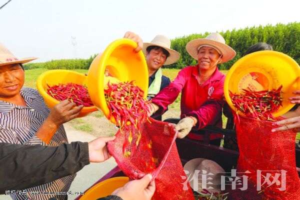 金秋十月,淮河两岸到处是一派丰收景象:梨酥枣脆辣椒红,粮满仓,农民笑脸扬。