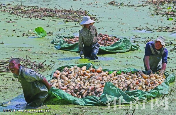 图二、三:毛集实验区中心社区莲藕种植基地,农民在采摘准备上市的莲藕。连日来,在毛集实验区万亩莲藕基地,17000多亩莲藕全面进入收获期。