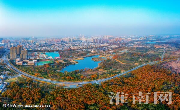 11月18日,舜耕山上空远眺淮南初冬美景。(无人机拍摄)当日,生态湿地色彩斑斓树木缤纷多彩,与主城区相映成趣,构成了一幅美丽的初冬画卷。