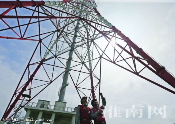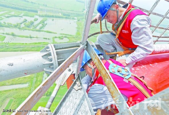7月21日,国网淮南供电公司输电运检中心人员对500至1000千伏超特高压淮河大跨越重要设备进行巡视检查,确保皖电东送大动脉迎峰度夏期间安全平稳运行。 (记者 倪军 摄)