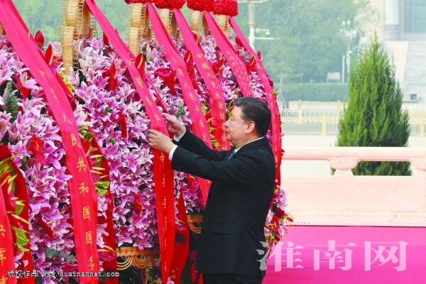 图:9月30日上午,党和国家领导人习近平、李克强、栗战书、汪洋、王沪宁、赵乐际、韩正、王岐山等来到北京天安门广场,出席烈士纪念日向人民英雄敬献花篮仪式。这是习近平整理花篮上的缎带。新华社记者 殷博古 摄