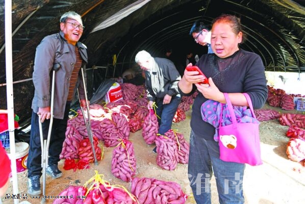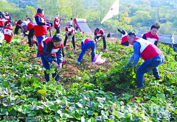 11月5日,淮南市红十字会志愿者帮助寿县八公山乡郝圩村残疾志愿者王士兵收获蜜薯,通过爱心义买,解决蜜薯销售不便的难题。