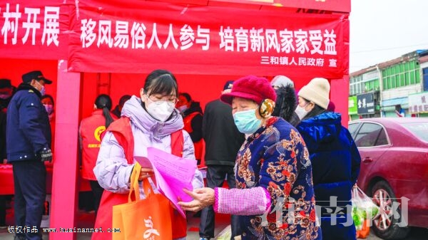 春节来临之际,淮南高新区三和镇在三和街菜市场门口设置宣传点,向过往居民发放移风易俗宣传资料,引导居民养成文明健康、绿色环保的生活习惯;倡导居民杜绝铺张浪费,树立勤俭节约的思想观念;提倡婚丧嫁娶从俭,争做文明新风的积极倡导者和自觉实践者。(记者 李东华 通讯员 李艳艳 摄)
