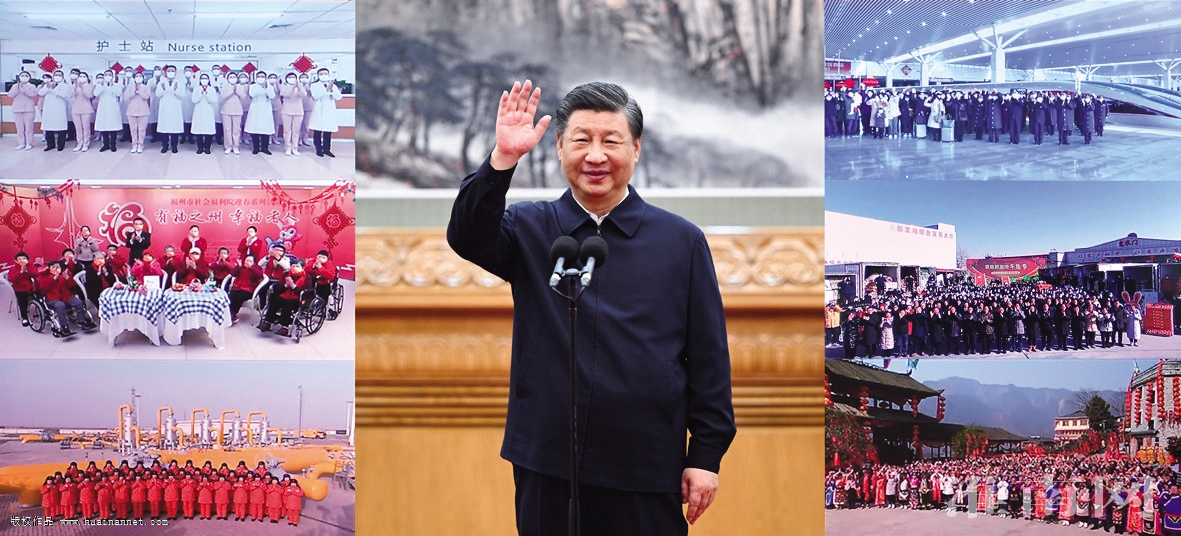 临近春节,神州大地处处洋溢着节日的喜庆气氛。1月18日上午,习近平在人民大会堂东大厅,同黑龙江、福建、新疆、河南、北京、四川等地基层干部群众视频连线,看望慰问防疫一线的医务人员、福利院的老年朋友、能源保供企业的员工、高铁站的干部职工、农产品批发市场的商户和群众、乡村基层的干部群众,给大家送去党中央的关心和慰问。