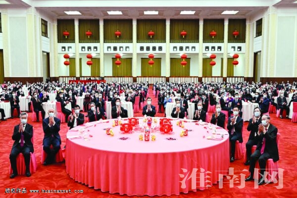 人民大会堂宴会厅灯光璀璨、暖意融融,各界人士齐聚一堂、共迎新春,现场洋溢着欢乐祥和的节日气氛。