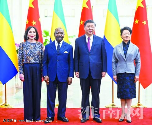 图为4月19日下午,国家主席习近平在北京人民大会堂同来华进行国事访问的加蓬总统邦戈举行会谈。这是会谈前,习近平和夫人彭丽媛同邦戈和夫人西尔维娅合影。