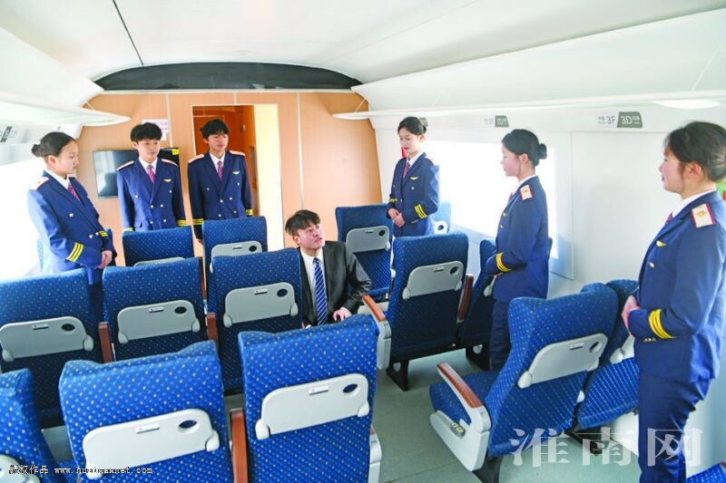 近日,位于谢家集区的安徽丹外信息工程中等职业技术学校高铁班学生在模拟高铁车厢内学习乘务员服务技能。该校以对口高考升学和就业为特色,开设汽车应用与维修、电子商务、幼儿保育、高铁等热门专业。近年来,我市大力推进职业教育发展,通过职普融通、产教融合、科教融汇,各类职业院校与400余家大中型企业建立校企合作关系,开设市场需求的各类专业200余个,积极培养高素质技能人才。(记者 陈 彬 摄)