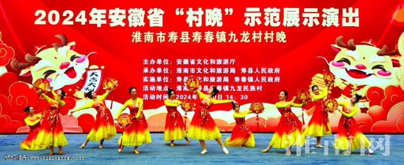 1月30日下午,“大地欢歌 美好安徽”2024年安徽省“村晚”示范展示演出——淮南市寿县寿春镇九龙村村晚在该镇九龙民族村举办,安徽文化云进行了全程直播。本场活动由安徽省文化和旅游厅主办,淮南市文化和旅游局、寿县人民政府承办,寿县文化和旅游局、寿春镇人民政府实施。整场演出共编排13个节目,舞龙表演、寿州大鼓、大洪拳、查拳、石锁、寿州锣鼓、楚韵锣鼓等富有浓郁地方特色的精彩节目激情上演。 (通讯员 郑玉基 陆士德 摄)