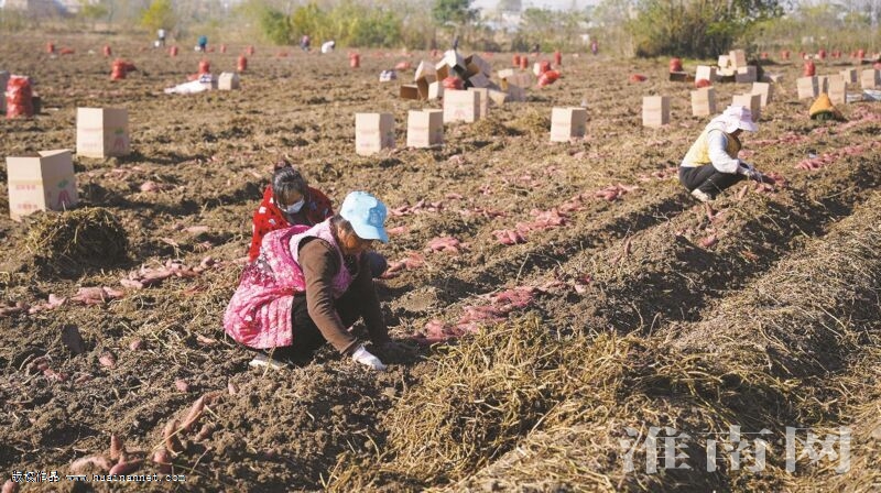 淮河早报、淮南网记者近日走进史院乡尹祠村800亩蜜薯种植基地,只见专业挖薯机器在田间来回穿梭,个个色泽红艳饱满的小蜜薯破土而出,村民们熟练地去土、分拣、装箱……现场呈现一派繁忙的场景。