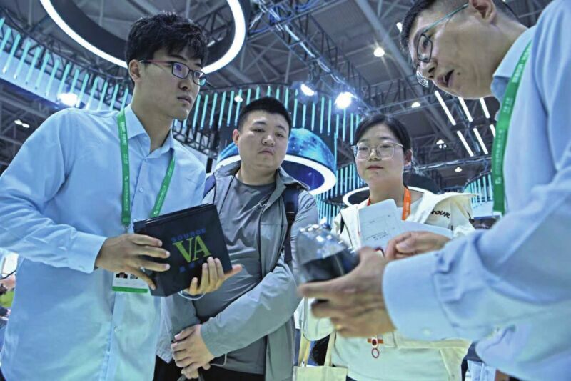 图一:2025世界制造业大会现场,观众了解淮南益恒科技有限公司展出的电池产品。