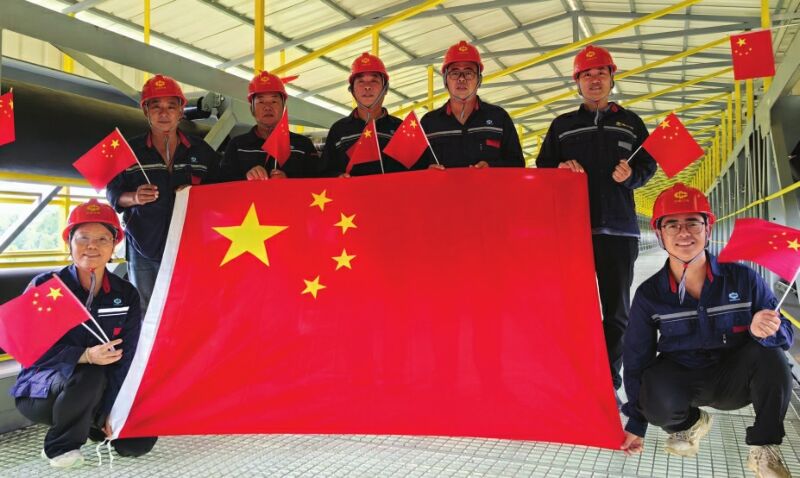 图三:电厂员工在岗位上与国旗合影。