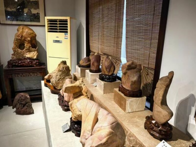 除了非遗技艺的精彩展示,文化园还巧妙融合自然与人文,特邀苏式园林设计师打造八公山岩石标本展示区。该区域以“移步换景”的造园理念为骨架,将八公山不同地质年代的岩石标本错落嵌入白墙黛瓦的景框,让游客在欣赏岩石纹理、色泽的同时,轻松读懂八公山的地质故事。