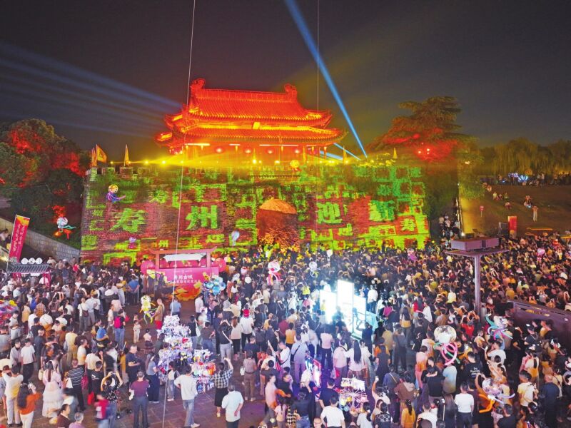 国庆中秋假期,寿县古城文旅活动精彩纷呈。10月7日晚,寿县宾阳门古城墙光影秀璀璨亮相,楚文化故事如画卷般铺展于宋代城砖之上,楚风纹样在灯光映衬下灵动流转,以沉浸式的体验方式,揭开“一城人文典故,千年魅力楚都”的浪漫篇章。