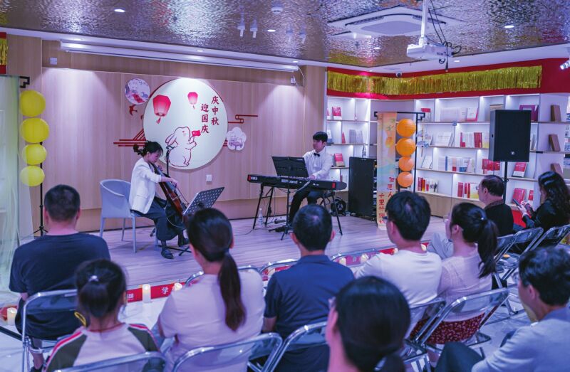 近日,淮南新华书店人民公园店举行“中秋夜・书香音乐会”。幻音室内乐工作室给大家带来了14首古典音乐经典曲目,钢琴声如月光般温柔流淌,大提琴的低吟似故乡河畔的晚风。现场的读者或闭目静听,或跟着节奏轻晃指尖,人们举着手机记录这抹月色与乐声交织的美好。活动既传递了团圆暖意,也让书香与乐韵交融出独特魅力。