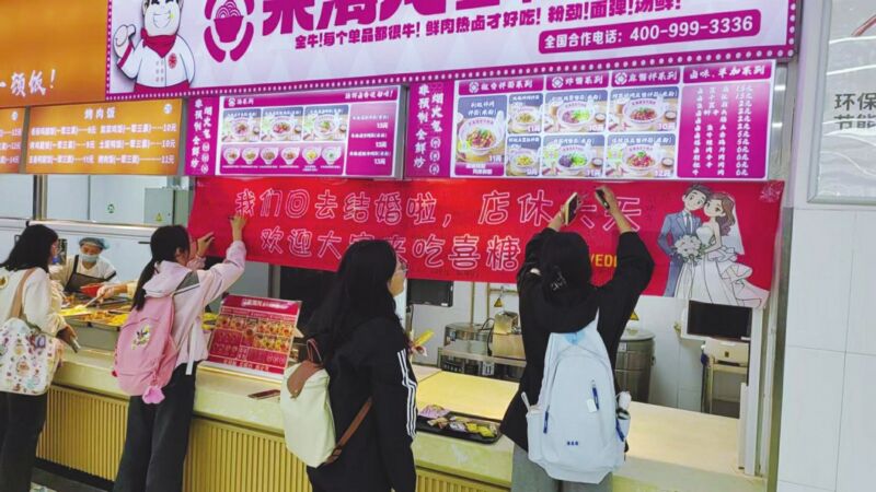 “我们是上个月25号休息,27号结婚的。档口突然关门,怕大家不知道我们去干嘛了,想报告一下歇业原因,也想和大家分享一下喜悦。”该档口老板胡媛媛告诉记者,她和丈夫是淮南本地人,此前在外地创业,今年因筹备婚礼回到家乡,于9月份在仁苑食堂开了这处美食档口。尽管开业时间很短,但和谐的相处让这对年轻夫妻感受到了学子们的活力与单纯。