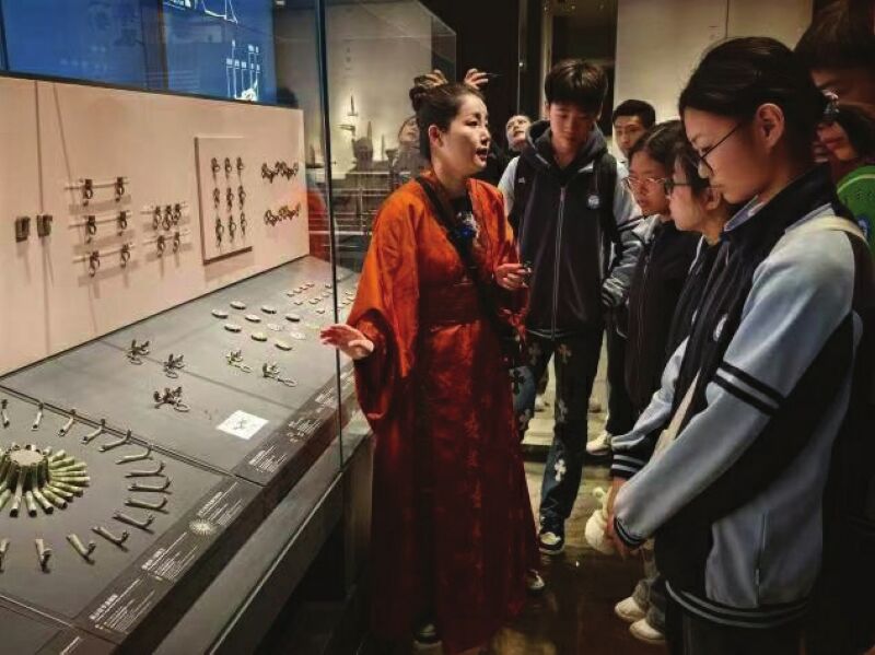 在安徽楚文化博物馆,学生们被展柜中斑驳的青铜器深深吸引。“这是楚国时期的剑,剑身的纹路还能看清铸造痕迹!”随着讲解员的介绍,有学生忍不住伸手轻触展柜玻璃,仿佛想透过冰凉的屏障,触摸千年前的铸剑火光。另一侧的寿县古城墙下,学生们指尖抚过砖石上的青苔感叹:“课本里说‘城郭坚厚,易守难攻’,亲眼看到才懂这城墙背后藏着多少历史故事。”