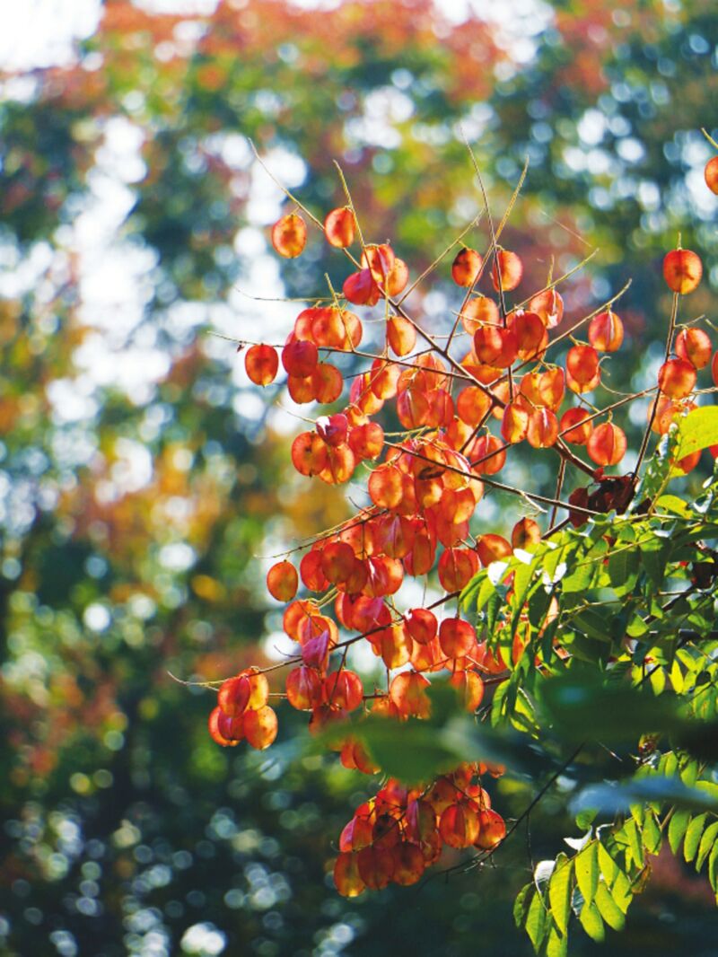 栾树是被誉为“秋日之韵”的植物,夏秋时开出稠密的黄花,花串褪去后,便结出小灯笼般的蒴果。随着季节轮转,蒴果色彩也逐渐变化,直至橘红。栾树蒴果成熟后,有的会掉落,风吹滚动,像小铃铛般沙沙作响。若细心剥开一个蒴果,便会发现其内部藏匿着几颗黑色的小圆粒,便是它的果实,是可以出芽繁殖的,也有人用它来做佛珠或手串。