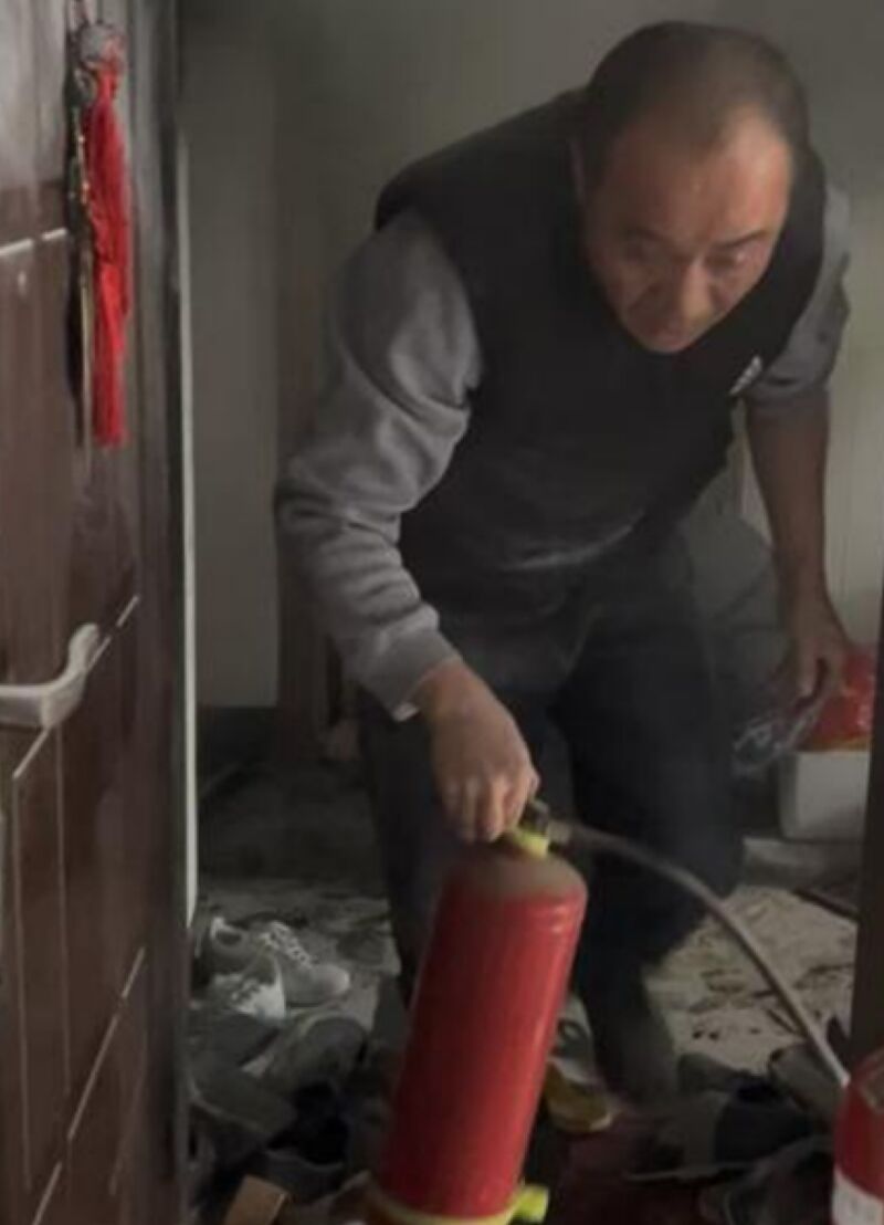 一个灭火器很快耗尽,接着第二个也用完了。火势仍在蔓延,屋内不断传出爆炸声,高温炙烤下,刘鹏远的衣服沾满灰烬,浓烟呛得他剧烈咳嗽。匆匆赶来的妻子看着丈夫狼狈的样子,心疼地劝阻:“太危险了,等消防队吧!”