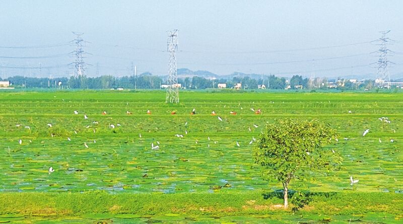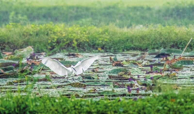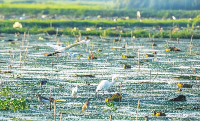 近日,大通区王楼村芡实迎来丰收,河塘中散落着采收后残留的芡实,洁白的白鹭被这天然“饵料”吸引,纷纷驻足塘中。时而飞翔寻觅,时而俯身啄食,嬉戏玩闹,翩跹起舞,构成一幅丰收与生态共生的鲜活画卷。
