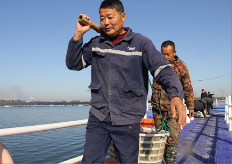 淮南市采煤沉陷区生态养殖牧场漂浮圏桶淮王鱼养殖基地里,漂浮在水面上的8个大型圈筒陆续进入收获季,漂浮圈筒直径4米,深3.5米,圈筒内水流涌动,淮王鱼、黄金鲫、罗非鱼、瓦氏黄颡等多个品种的鱼儿活力十足,漂浮圏桶养鱼“生态渔业示范模式”获得成功。在温暖的阳光照射下,鱼鳞泛着光,人们脸上洋溢着收获的喜悦。