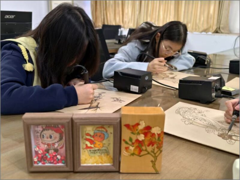 当炽热烙铁遇上萌趣IP,传统与潮流便碰撞出奇妙火花——烙画笔下的拉布布和星星人,在烙铁的轻重变幻中显形,点点烙迹化作星辰微光,硬朗的边缘被烟火气柔化,科幻感与传统韵味交织,让非遗技艺在萌系世界里焕发别样光彩。日前,安徽省工艺美术大师、淮南烙画传承人郑红伟在淮南市职业教育中心开设了烙画课程,带领学生用烙铁烫出现代魅力。