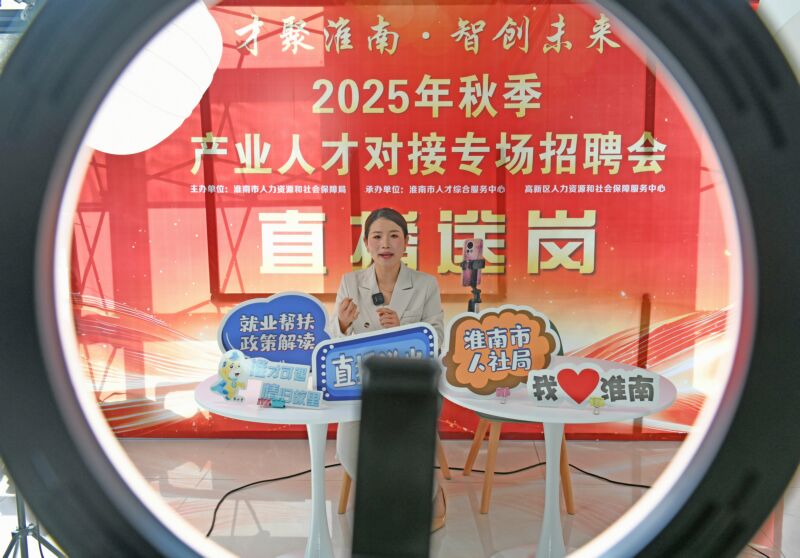 日前,淮南市2025年秋季产业人才对接招聘会现场,一名主播通过网络介绍招聘企业用工需求。当日,我市举行2025年秋季产业人才对接专场招聘会。招聘会采用“线上+线下、分类+分区”招聘模式,近百家参会企业提供就业岗位1000余个,涉及新能源汽车、先进制造业、信息技术等多个产业。