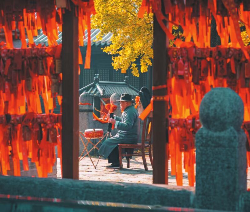 立冬的寿县孔庙,千年银杏通体鎏金,与古殿的飞檐斗拱相映如画。大成殿前,寿州大鼓声起,震彻云霄。柴现修先生一袭青衫,手持云板击节,挥动重槌落鼓,开口如钟鸣般唱起《赵匡胤困南唐》。鼓点密如急雨,唱腔苍劲沉郁,仿佛将千年时光凝于一声一韵之中。那铜声铁板之间,恍然已是千年流转,多少悲欢传奇,皆在这方寸舞台间重现人间。
