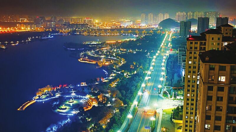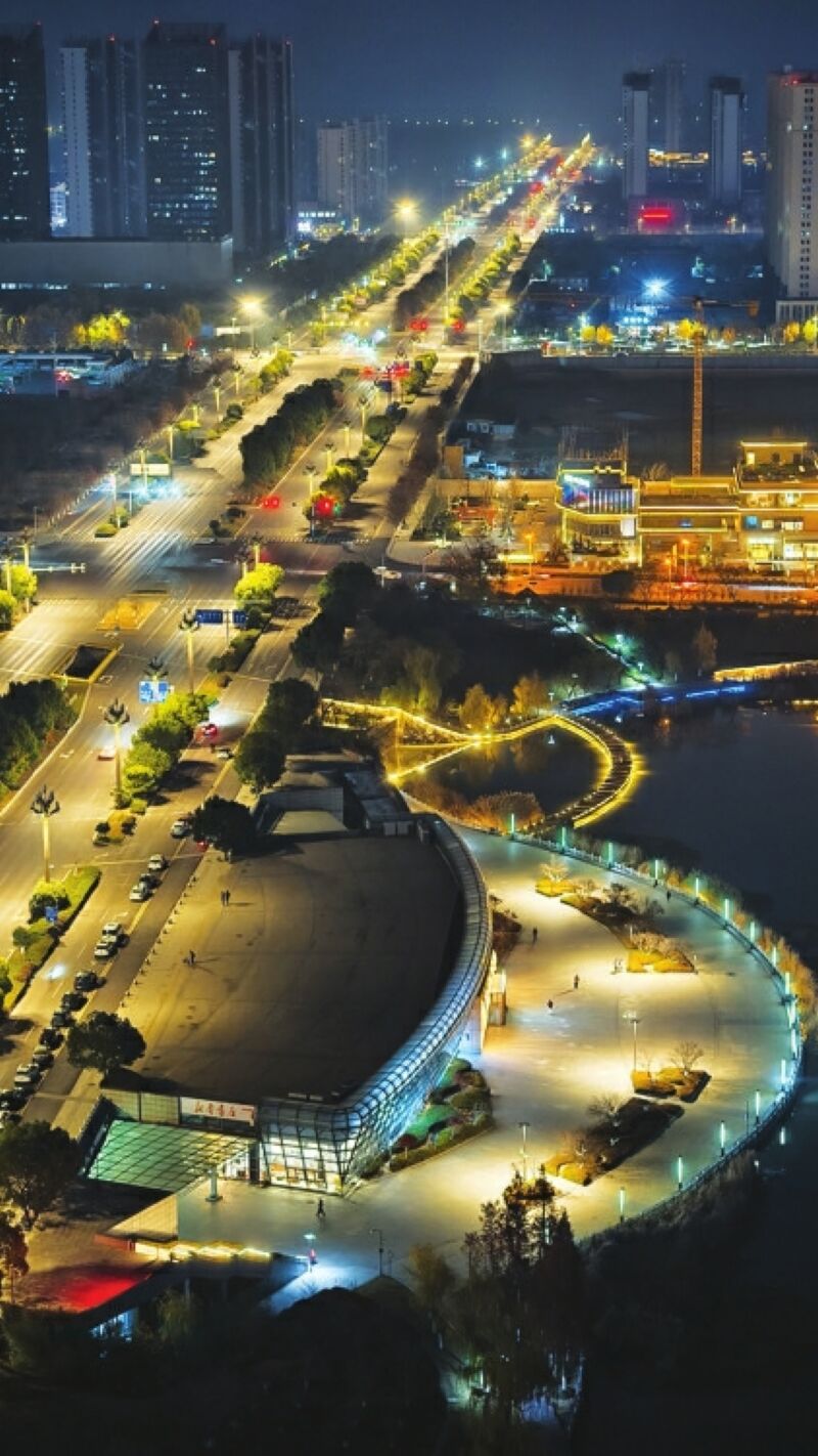 夜幕降临,车流蜿蜒,璀璨的灯光在楼宇间流转、在街道上延伸,交织成熠熠生辉、星光点点的银河带,将夜空与大地温柔相连,一轮红月相映,尽显都市夜景的繁华与浪漫。