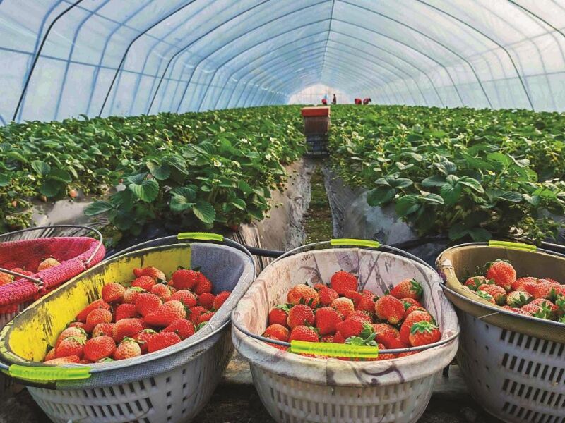 1月5日,莓农在潘集区城北村草莓大棚内采摘草莓。小寒时节,中煤新集公司定点帮扶的潘集区城北村种植的300多亩草莓相继成熟,驻村帮扶人员与果农们一起忙着采摘、装盒,产品销往全国各地,促进莓农增收。