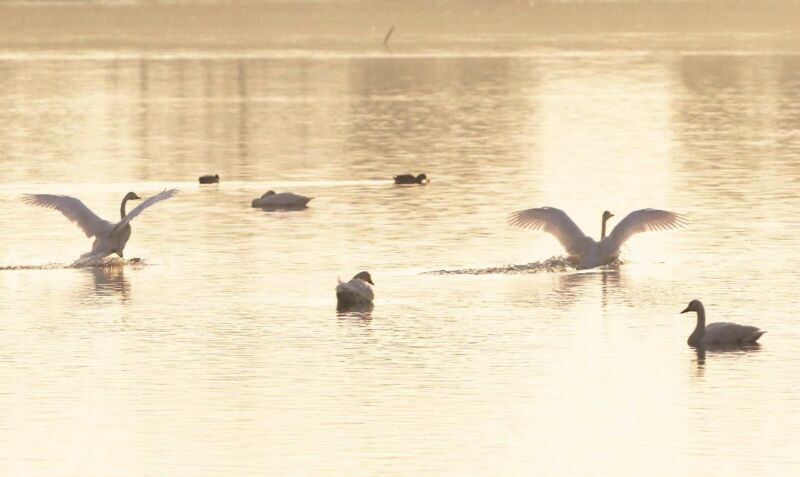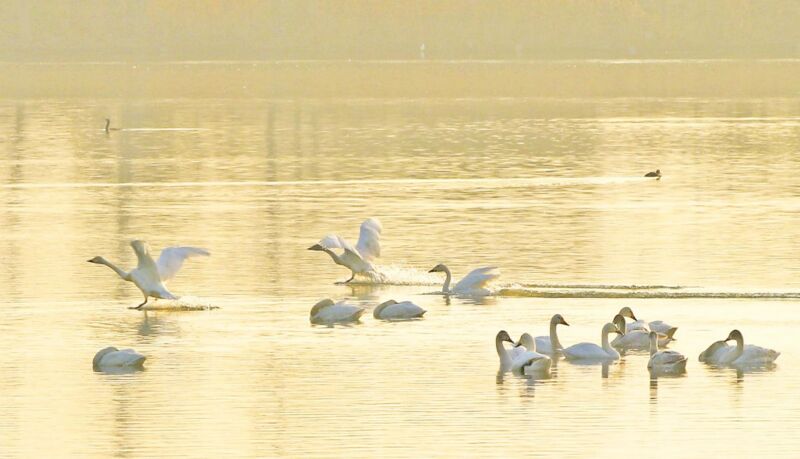 图为天鹅在蔡城塘共舞。