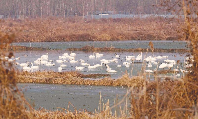 谁能想到,这方候鸟天堂也曾历经生态困顿?泥沙淤积、植被凋零的困境,曾让这片古塘黯然失色。幸而清淤净水的巧思、乡土树种的补种、司法修复基地的建立、联合巡查护鸟的举措如一缕春风唤醒了湿地的生机。如今,千余只天鹅、大雁、野鸭等鸟类在此翩跹集结,它们或在澄澈湖面悠然凫水觅食,或掠过摇曳的芦苇荡振翅高飞,各色羽翅划破长空。