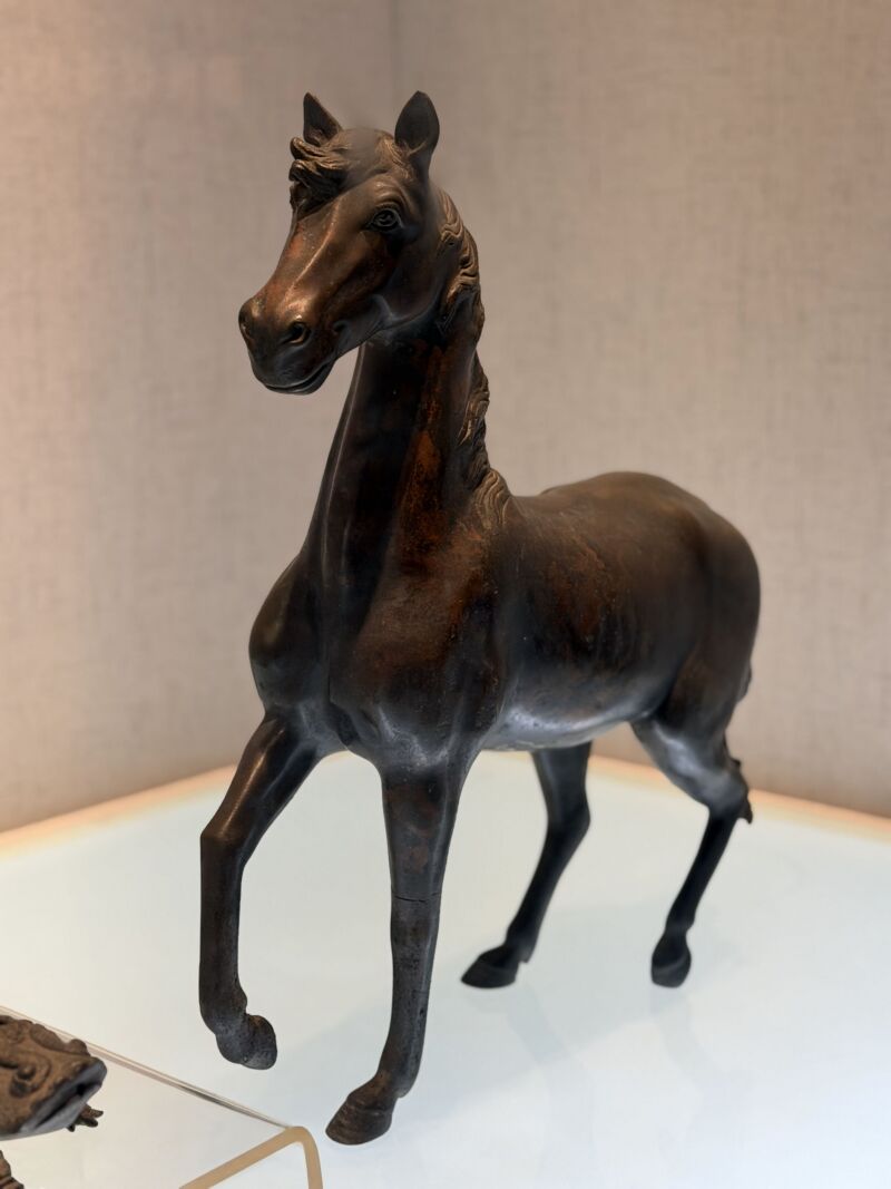 1月13日,跟随讲解员黄鸣玥的指引,我们步入市博物馆“淮土遗珍”展厅。在温润的灯光下,一尊清代红铜马雕塑静立台面。它以精炼红铜塑成,通体呈现深邃而温润的枣红色,历经时光摩挲,光泽内敛厚重。细观其态:马首昂扬,目光炯炯前视,双耳警觉竖立;颈部线条圆融丰满,身躯壮硕雄健,充盈着蓬勃的生命力。它右前足高扬,左后足似将离地而未离,三足稳健着地,恰似行进中蓦然提速、阔步向前。尤为生动的是,匠人巧妙刻画了奔驰之瞬间——马鬃与马尾的毛发皆被疾风吹拂向前,仿佛能听见呼啸之风与奔腾之音。整体造型在力量感的蓄势与行进间的动感中取得精妙平衡,威武昂扬而又气定神闲,将马的遒劲之力与灵动之姿凝聚于永恒。