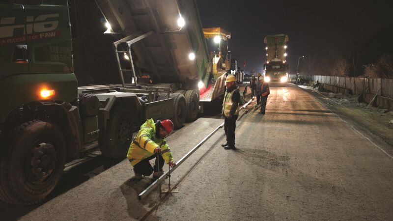 在施工现场,记者看到,数辆绿色自卸车来回穿梭运送物料,摊铺机轰鸣着稳步前行,压路机紧随其后精准压实,整套作业流程规范有序。施工人员身着工装分散在各个岗位,有的紧盯摊铺厚度,有的检查物料质量,相互配合默契十足。尽管夜间寒风刺骨,但大家丝毫未受影响,始终以严谨细致的态度把控每一处施工细节。