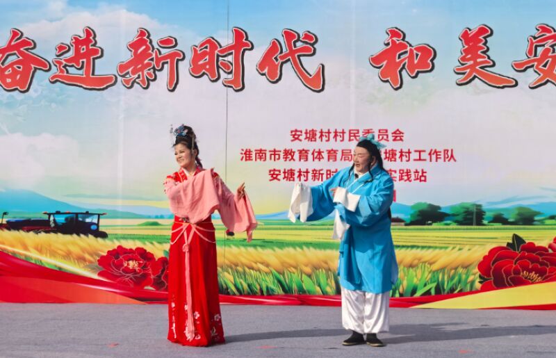 当日,演出在激昂的民乐合奏《地道战》主题曲中拉开序幕。随后,悠扬婉转的黄梅戏选段《难得相逢在人间》、电吹管齐奏《茉莉花》《小城故事》等节目接连上演,赢得阵阵掌声。由市教体局驻安塘村第一书记、工作队队长周世春创作、本村村民表演的三句半《安塘村礼赞》,以朴实诙谐的语言细数家乡变化:“锣鼓一敲震天响,安塘乡亲聚一堂……孔店乡里气象新,智慧农业闪光芒,大棚果蔬销全国,钱满仓!”节目生动反映出产业兴旺、生活富裕的新面貌,引发全场共鸣。特邀推剧演员代华带来的《送茶路上》,也让村民近距离感受到非遗文化的魅力。