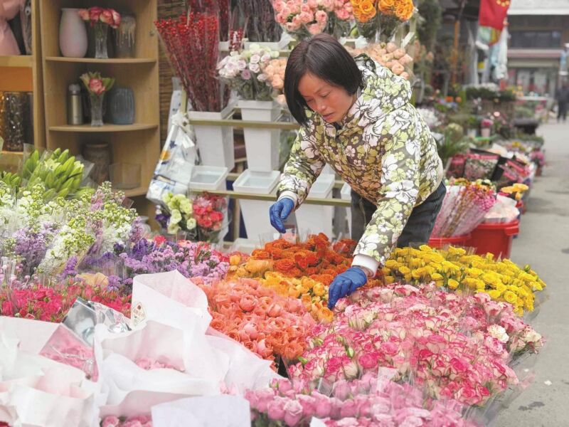 对面的鲜切花摊位上,一位戴蓝色手套的店员正仔细整理成堆的鲜花。店内玫瑰、康乃馨、百合等花束层层叠放,一旁的木质货架摆满花瓶与装饰,周围散落着包装材料。店主王女士正为两位老年顾客包扎一束百合,“最近每天都是从早忙到晚,好多顾客一买就是两三束。”她手下不停,笑着说道。