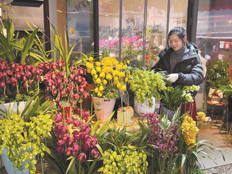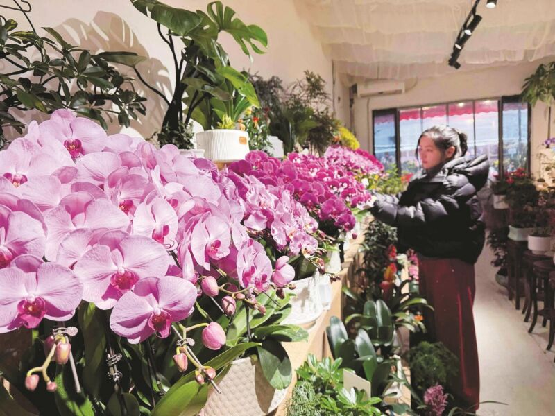 “老板,我要这盆紫色的‘仙客来’……”“好嘞,这就给您装起来!”近日,店主陶女士正在店内整理花卉。她的花铺中,紫、粉、黄等各种盆栽争奇斗艳,价格覆盖亲民到高档不同区间。蝴蝶兰、大花蕙兰因寓意“幸福到来”而备受喜爱,加之花期较长,成为许多顾客的首选,稳居店内的“C位”。“这几天生意不错,平均每天能卖出二三十盆,颜色鲜艳、花期长的最受欢迎。”陶女士一边整理花架一边说。为了备战春节销售,她早已联系好上游供货商,确保节日期间货源充足。