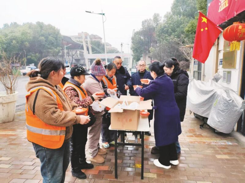 1月26日,田家庵区人民路一商家发起“粥暖腊八·致敬城市守护者” 感恩回馈活动,员工将热气腾腾的腊八粥送到环卫工人手中,为他们送上温暖。