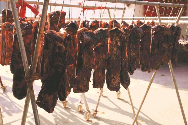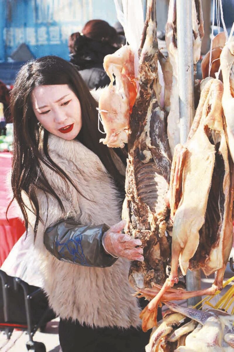 “咸货晒透了,味道才正!”另一条巷子里,成串的香肠、咸肉、板鸭、咸鱼从简易架子上垂挂下来,在光线下泛出琥珀般的油润。浓郁的咸香混合着花椒、八角的气息,扎实地弥漫在空气里。“香肠20元一斤,板鸭45元一只……”结伴而来的阿姨们熟练地轻捏香肠的硬度,比较着肥瘦,交流着买菜心得。
