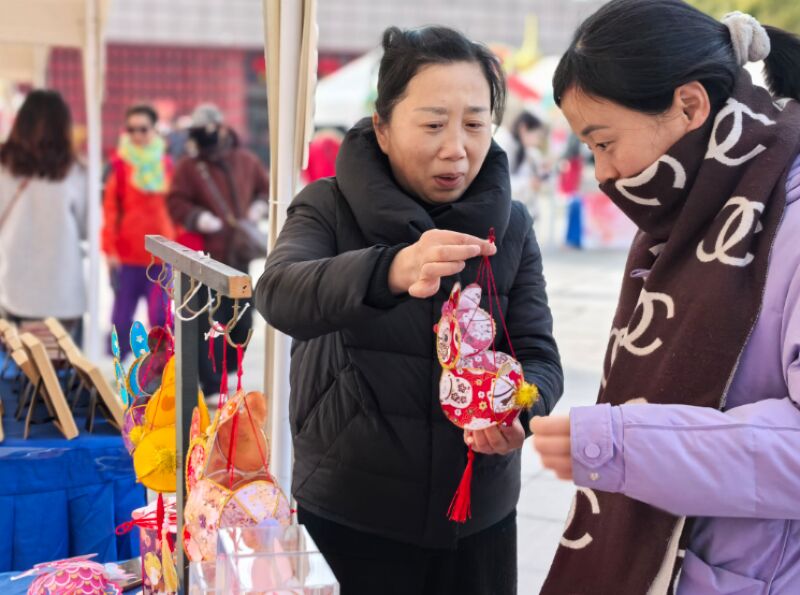 另一侧的非遗集市更是人头攒动、热闹非凡。近20个展位依次排开,文创产品、非遗手作、地方土特产琳琅满目。非遗剪纸传承人周琴指尖翻飞,一张张栩栩如生的生肖窗花顷刻而成;烙画传承人郑红伟展示着生肖主题作品,希望通过传统技艺让更多人感受淮南非遗魅力。灯彩摊位前,不少家长带着孩子挑选彩灯,处处洋溢着喜庆氛围。从精巧的传统手作到地道的家乡味道,市民们驻足体验、精心选购,把浓浓的“淮南年味”带回家。活动现场,市图书馆、市文化馆还带来了年俗图片展,以图文形式生动讲述春节传统习俗,让市民在逛玩中感受传统文化的深厚底蕴。