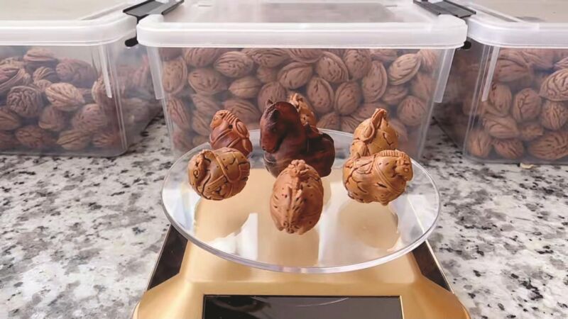 李传福深耕核雕技艺已有二十余年,自幼受家族木雕、手工编织技艺熏陶,他对八公山本地野生毛桃核怀有深厚情感。为保证原料品质,每年三四月桃花盛开时,他便进山踏勘桃树位置;待到八月果实成熟时,他又亲自上树采摘新鲜毛桃核。这些在常人眼中弃之无用的桃核,因颗粒饱满、纹理清晰、密度极高、入水即沉,成为核雕的上佳材料。在李传福的巧手之下,普通桃核化身为平安锁、小元宝、小茶壶、牡丹花等精巧作品,件件灵动雅致,成为独具特色的指尖艺术品。