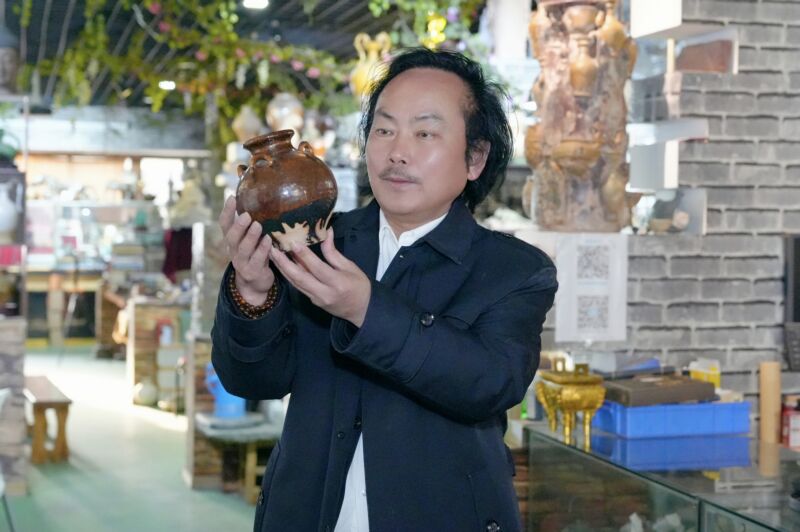 朱兆龙查看烧制的寿州窑陶瓷作品