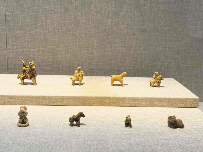 “在众多玩具中,马是绝对的主角。”黄鸣玥指着这组展品说道。只见这组玩具中,有头戴尖顶“胡帽”的西域商人,骑着体格健硕的大马,马匹昂首挺立,颇具异域风情;也有稚气未脱的童子,轻松骑跨在马背上,比例夸张,充满童真意趣。仔细观察,这些玩具的成型工艺颇具巧思:通常分为动物躯体、人身、人头三部分制作,人头处留有接胎痕,再用篦状工具压划出眉眼衣纹;马的四腿则以四根泥条粘接而成。手法简练概括,却让每一匹小马神态迥异,生机盎然。