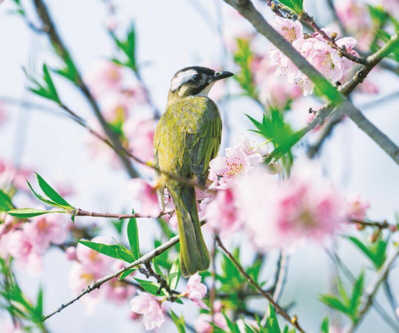 在人民公园北侧,春光暖阳,桃花灼灼如焰。白头鹎在花间轻盈穿梭,于枝头婉转歌唱。鸟语清脆,花香浮动,自成一幅灵动的春日画卷。