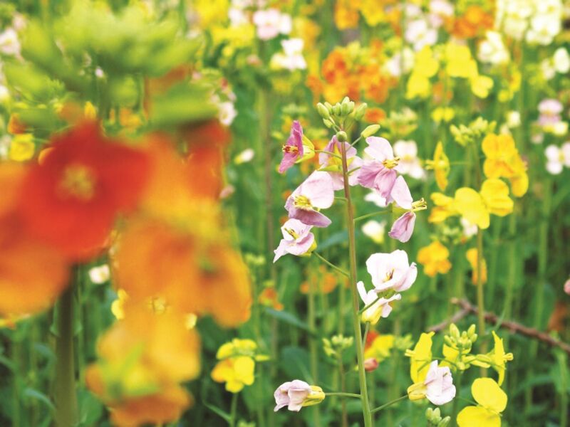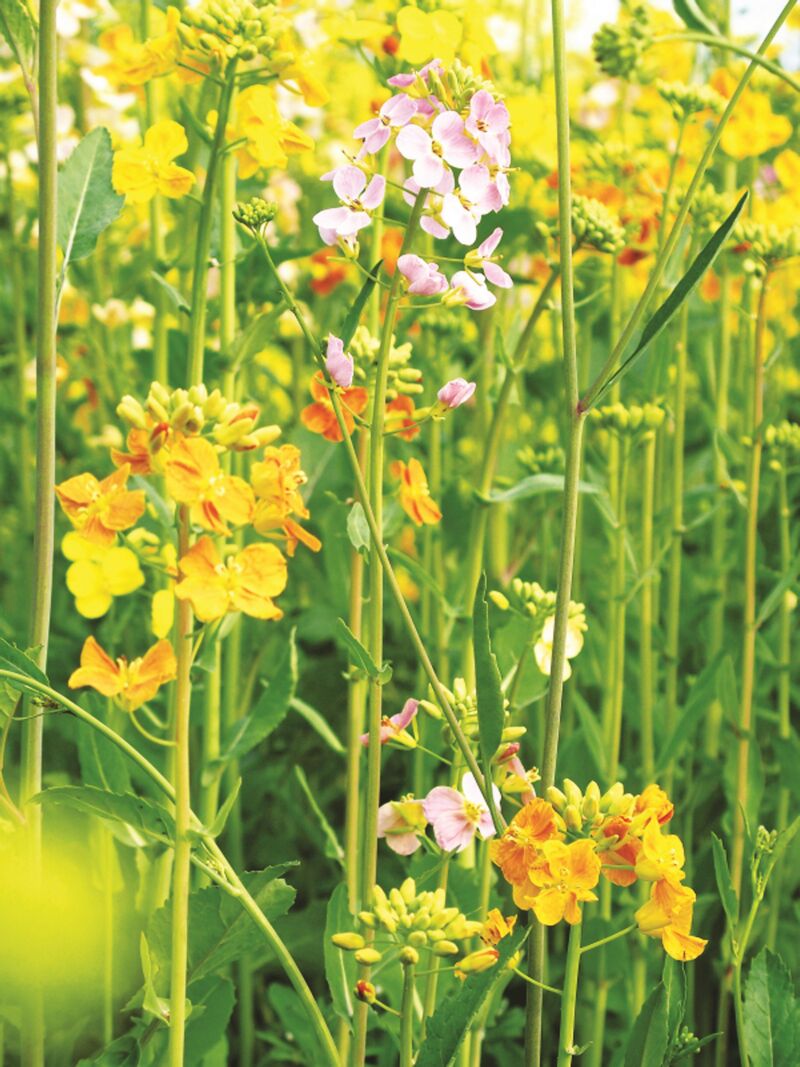 彩色油菜花的选育主要通过两种途径实现:自然突变和远缘杂交。自然突变是育种人员在田间留意并收集因自然突变产生的“异色”单株,作为育种的起点;远缘杂交实质上就是将油菜花与萝卜、甘蓝、青菜等十字花科植物进行杂交,将特殊颜色的基因引入油菜中。先杂交再纯化,通过优中选优的漫长筛选,使新的花色不再分离,能够稳定遗传,从而培育出新的彩色油菜花品种。