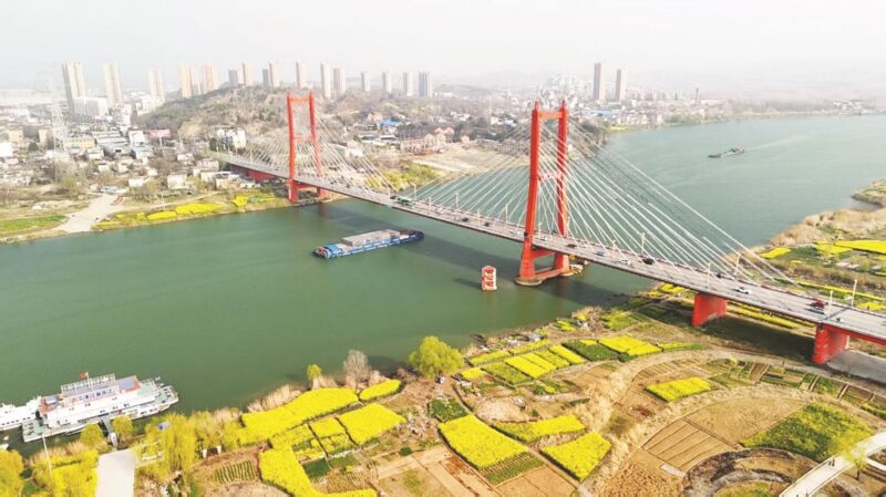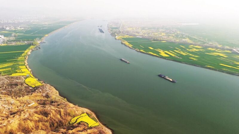 春分时节,在凤台县淮河岸边,油菜花绵延铺展,春意盎然。水上货船穿梭,煤炭、建材等物资往来不息,呈现出一派繁忙的航运景象。