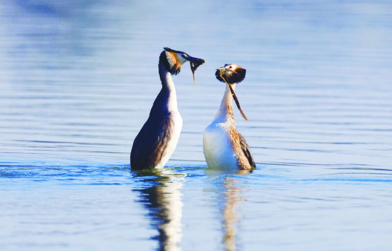 人民公园水塘内的凤头鸊鷉又到了恋爱季节。