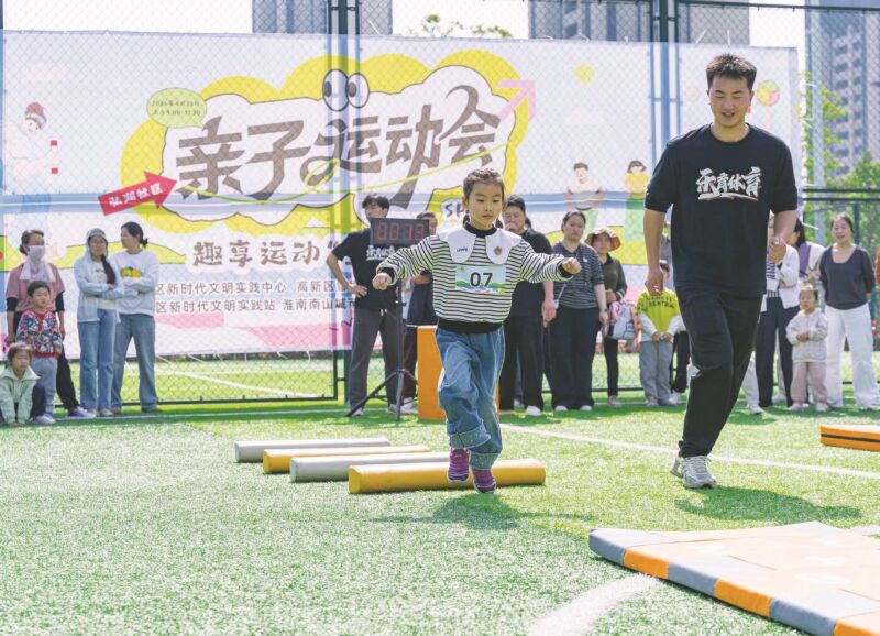 春风和煦,暖意融融。4月26日,淮南高新区新时代文明实践中心、弘湖社区新时代文明实践站联合高新区管委会重点工程管理中心、淮南南山城市运营有限公司、淮南乐育少儿运动中心共同开展“趣享运动 ‘童’样精彩”亲子运动会。活动设置障碍跑、亲子投篮、接力袋鼠跳等趣味项目,家长与孩子默契配合、携手闯关,现场欢声笑语、氛围热烈。大家在运动中增进亲情、拉近邻里距离,展现出积极向上、文明友爱的精神风貌。此次活动以运动为纽带,让孩子们在陪伴与欢笑中快乐运动、健康成长,进一步凝聚了家庭合力,为建设温馨和谐的幸福社区增添了生机与活力。