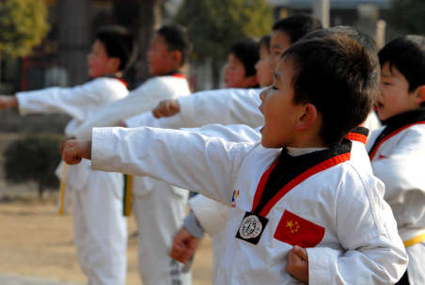 图为1月24日,体育场内一群孩子在练习跆拳道。
